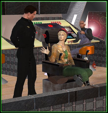 She gives the techie the order to open the com and—for what will be the first of many times to come—hears the voice of Captain Kel-Paten. The Kel-Paten. But only his voice. Visual’s out. In order for short-range scan to function at all, it has to be.